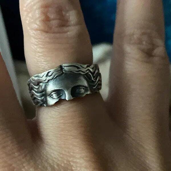 • The Classical Deity Face Ring: An adjustable, high-relief silver ring depicting a serene, statue-esque face. Inspired by ancient Roman and Greek art, it adds a touch of "Dark Academia" to any outfit.